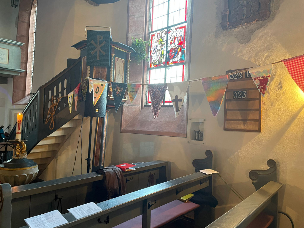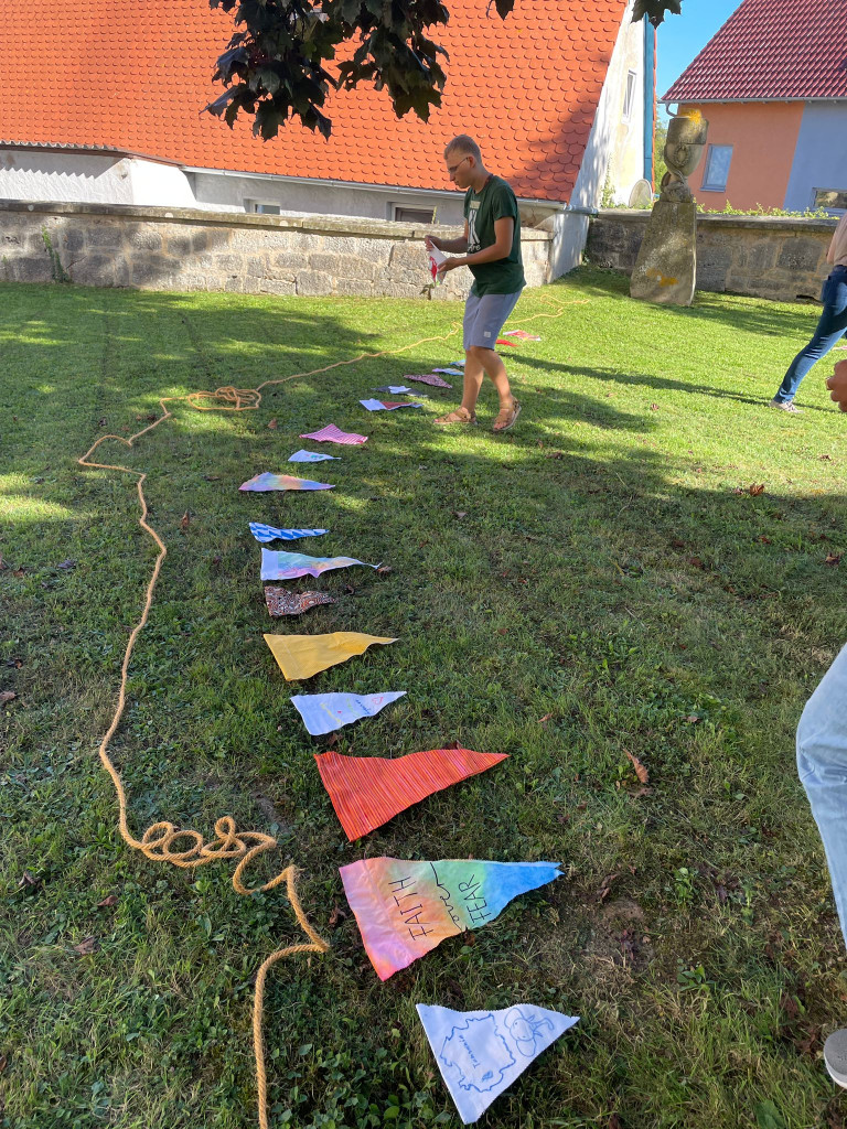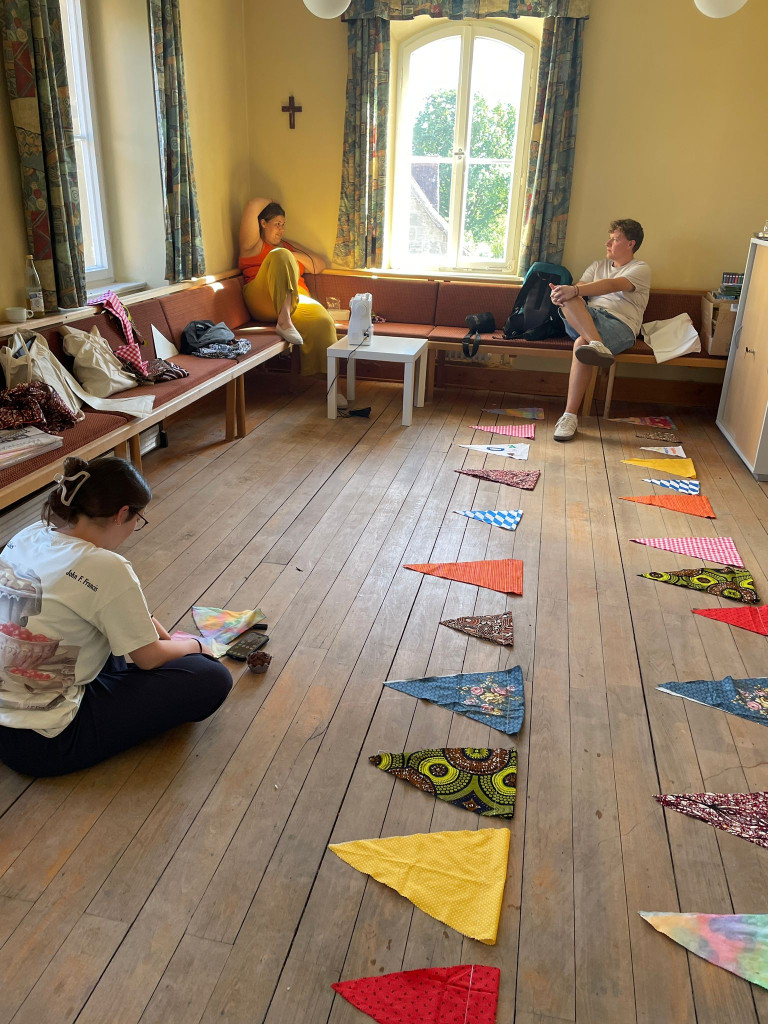 Die Wimpelkette entstand während des Partnerschaftsbesuchs im Rahmen einer Jugendaktion der Dekanate Hai in Tansania und des Dekanats Rothenburg im September/Oktober 2025. Die verschiedenen Stoffe repräsentieren unsere beiden unterschiedlichen Kulturen und das Seil repräsentiert unseren Glauben und unsere Einheit. Diese Arbeit wurde von Jugendlichen aus dem Dekanat Rothenburg und Hai gemeinsam geleistet, um eine bleibende Erinnerung zu schaffen und unsere Einheit, Liebe und unseren gemeinsamen Glauben zu repräsentieren.